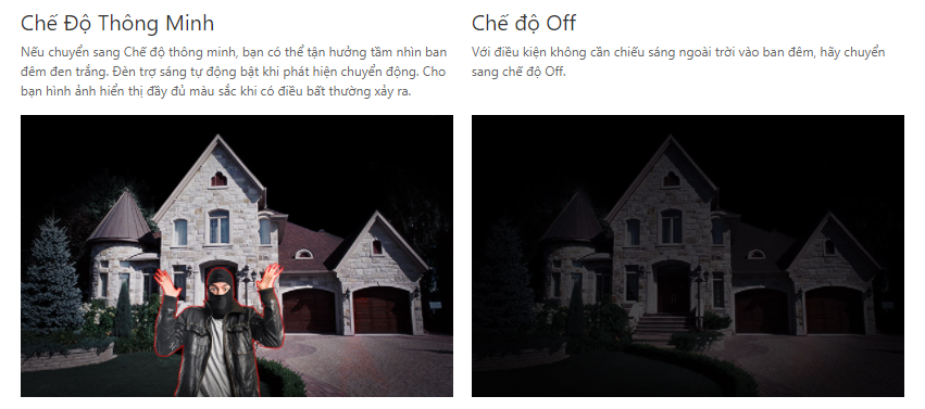 ✔ Chức năng thông minh – Nếu bạn chuyển sang Chế độ thông minh, bạn có thể tận hưởng tầm nhìn ban đêm đen trắng. Đèn sân khấu tự động bật khi phát hiện chuyển động đáng ngờ, giúp bạn hiển thị hình ảnh đầy đủ màu sắc sống động khi có điều gì đó xảy ra.