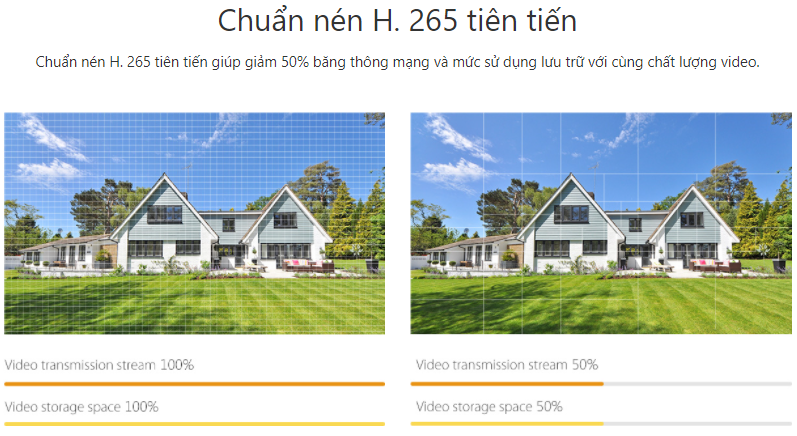 Nén H.265 tiên tiến giúp giảm 50% băng thông mạng và mức sử dụng lưu trữ với cùng chất lượng video